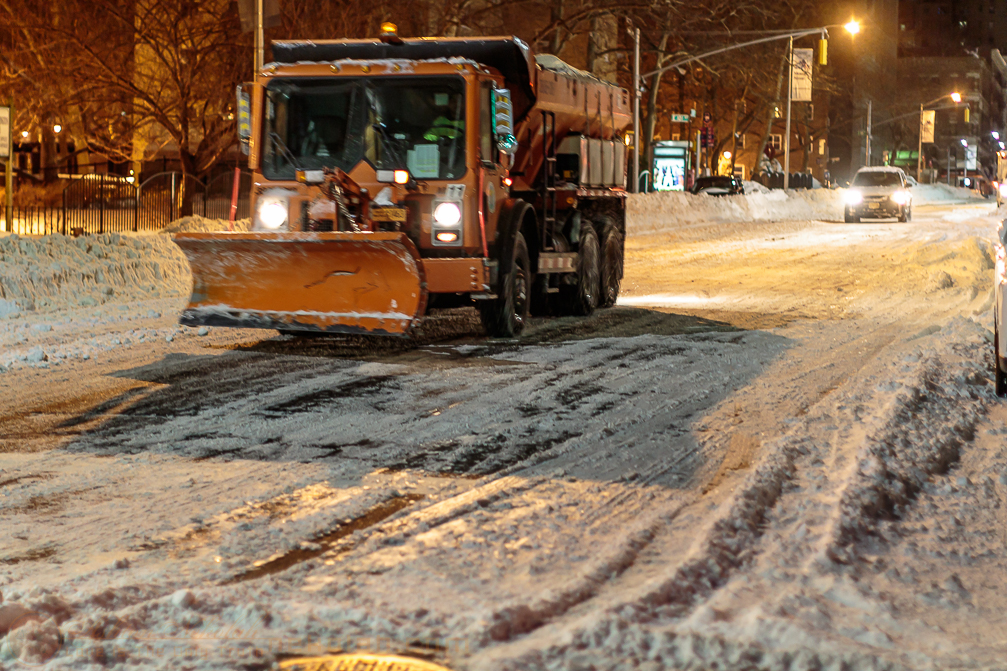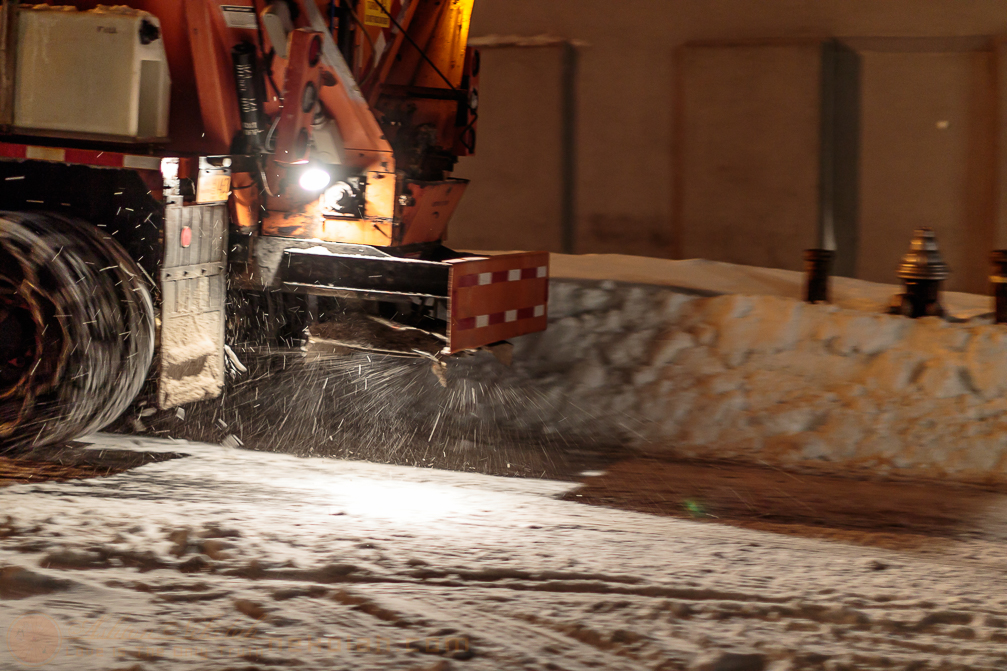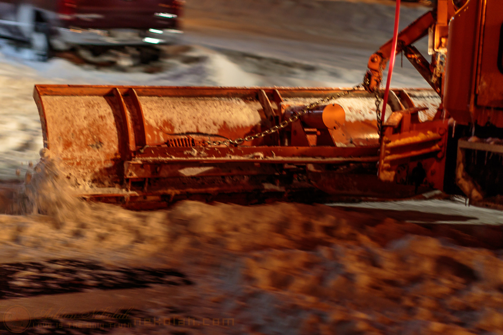 Snowplow trucks rome the night to clear out the streets. (#)