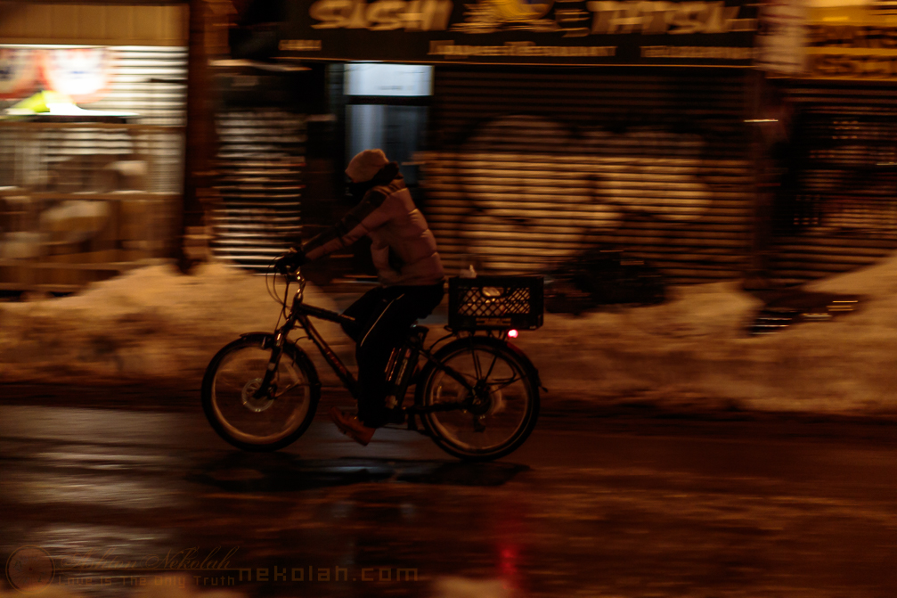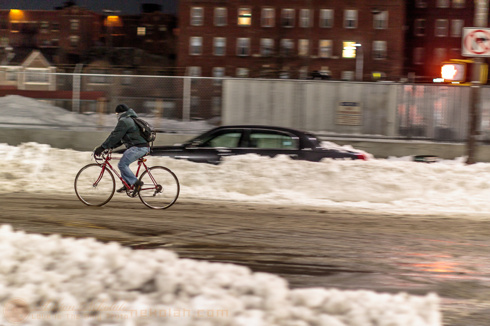 A rider is on his way home on a slushy street. (#)
